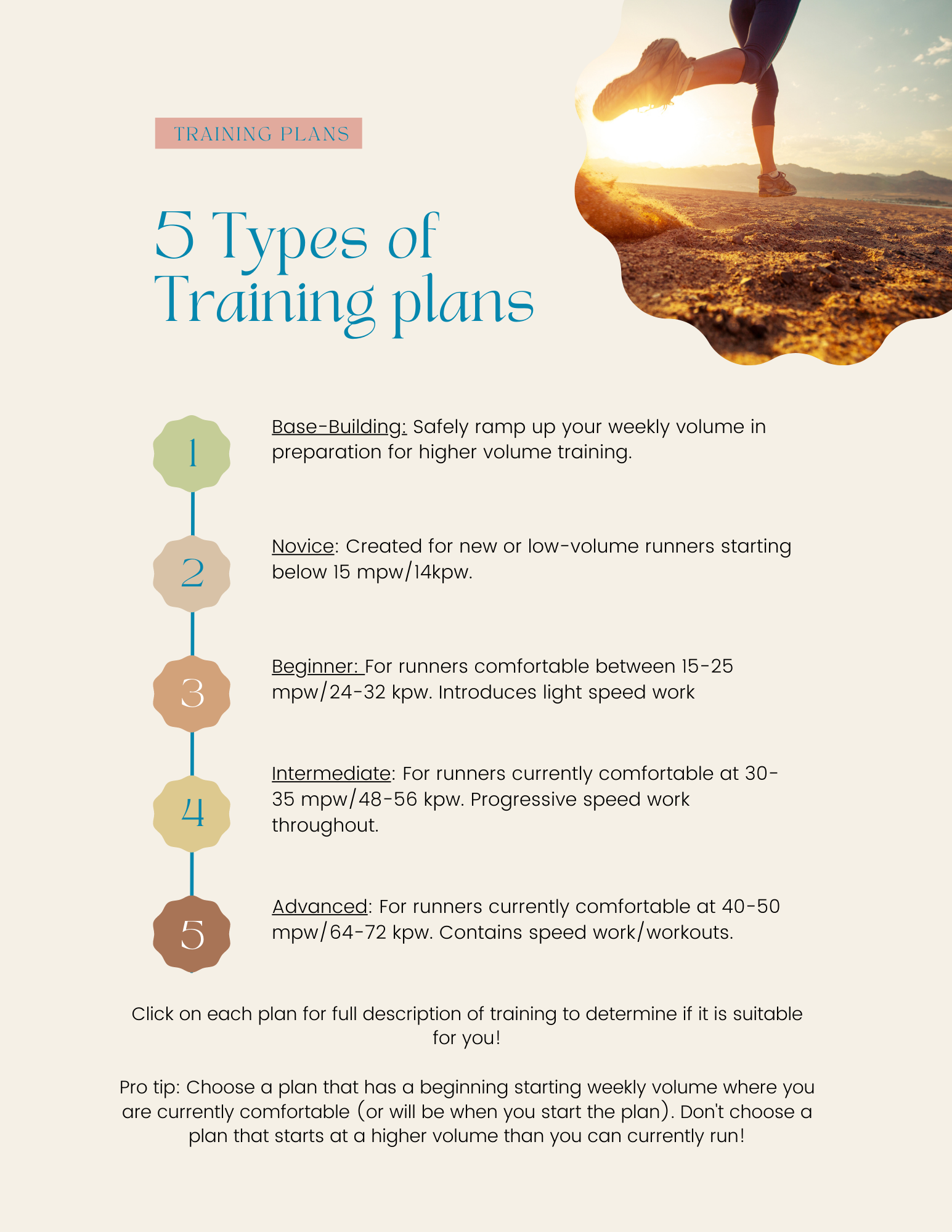 This plan is designed for first-time marathoners and/or lower-volume runners who want to build the capacity to cover the marathon distance while working a on a little bit of speed to add some variety and change up the pace of your training! It is recommended that the runner who participates in this program has completed a half marathon and is comfortable with a range of paces in their running. This plan starts with 4 runs per week + 1 cross-training session and builds to 5 runs per week. The starting weekly mileage is 16 miles/27 km per week and peaks at 43 miles/68 km per week. The longest long runs in this plan are 16 miles/26 km long, and the rest of the plan is built around supporting that distance as your longest long run. This plan also contains a 4-week post-race recovery schedule, a Race Day planner worksheet, recommended warm-up & cooldown routines, core exercises and lower body strength training exercises, information on goal setting/pace calculators, hydration, fueling, and more! "Why isn't there a 20 mile/32 km run on this plan?" Research supports designing long runs with two parameters in mind: as approximately a quarter to a third of your total weekly volume, and also 3-3.5 hours maximum. Because this plan maxes out at 43 mpw/68 kpw, it's not appropriate for your Long Run to be 20 miles/32 km. But remember, marathon training isn't about any single long run distance; it's about the entirety of your training cycle. Furthermore, there are ways to achieve the same adaptations over 2 runs instead of one longer run; this whole plan is built around those concepts!